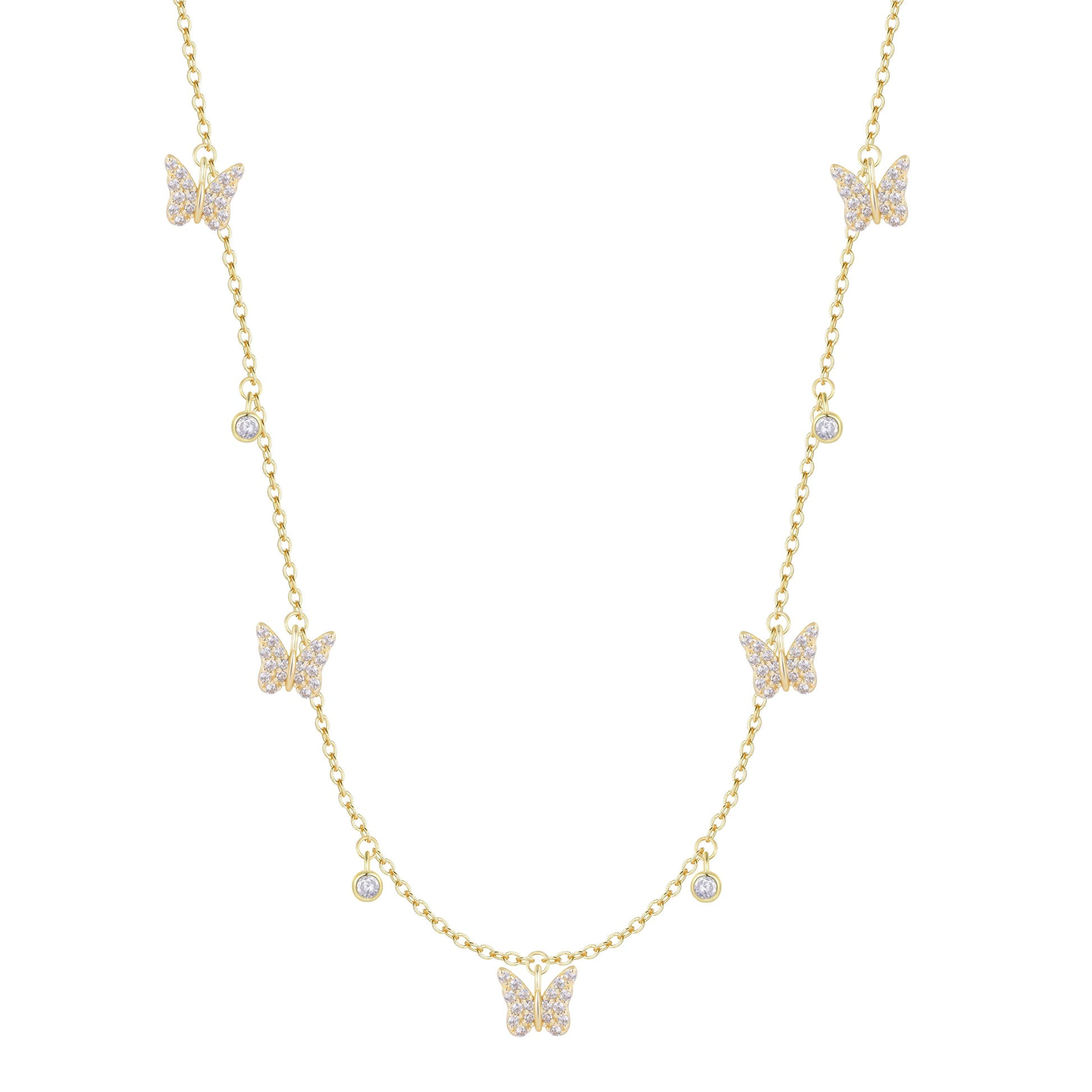 This delicate choker captures the beauty of transformation in motion, with tiny butterfly charms dancing along the chain, each one separated by sparkling cubic zirconia drops, like glimmers of sunlight as wings flutter by.