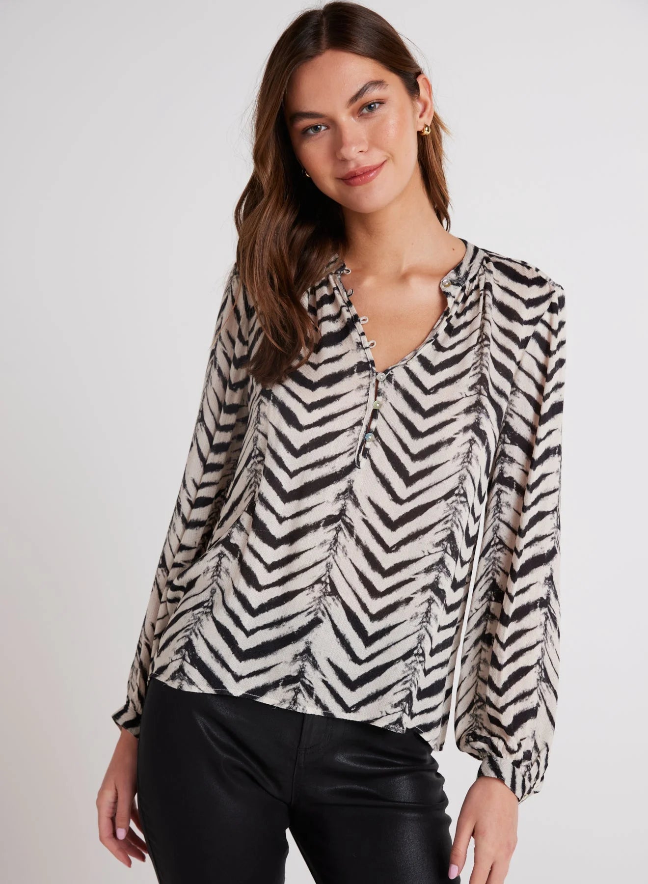 Featuring a beautiful batik chevron print, this pullover blouse is the perfect blend of comfort and style. With its unique features, it offers a sophisticated look and a soft feel for all-day wear. Elevate your wardrobe with this must-have piece. 100% Rayon