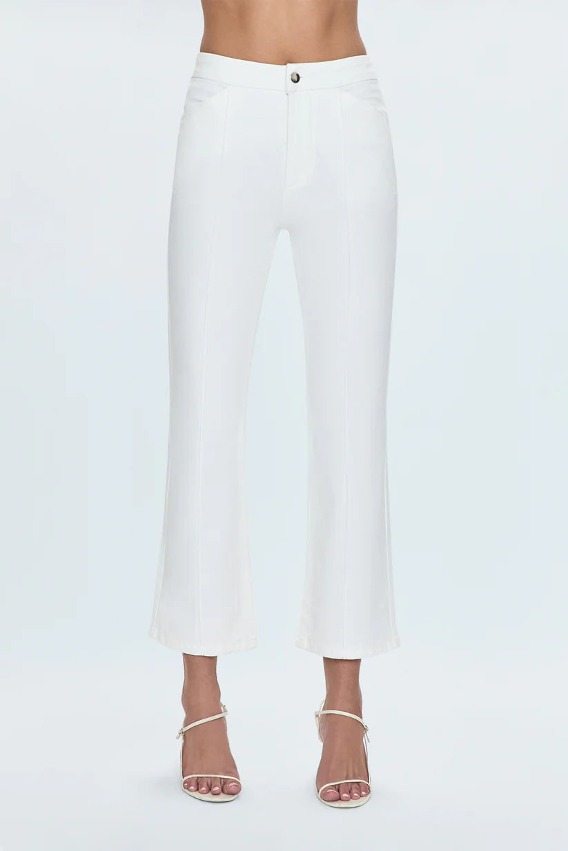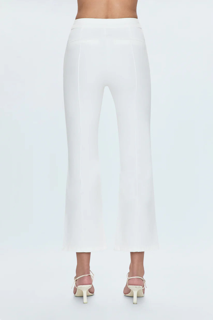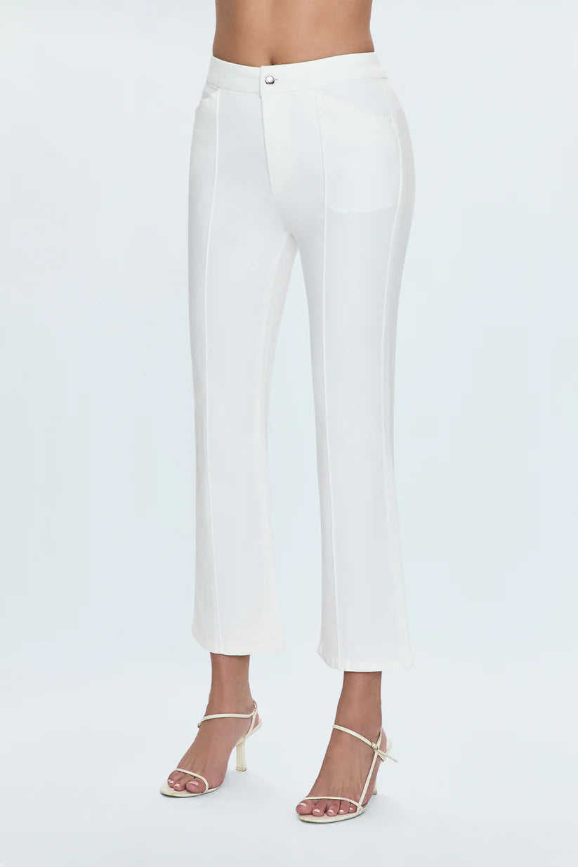 Mid rise kick flare trouser crafted from lightweight stretch ponte. Rooted in our best selling bootcut denim silhouette with a 27" hem length. Pintucked seaming detail across front and back. Slant front pockets and welt rear pockets.